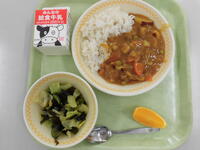 今日の給食(むぎごはん、ぎゅうにゅう、ぐんまのわふうカレー、わかめサラダ、オレンジ)今日は、カレーの日にちなんだ献立です。1982年に全国学校栄養士協議会が、学校給食の35周年を記念し、1月22日を全国の学校でカレーを提供する日として呼びかけたことから、1月22日がカレーの日となりました。本校の今日のカレーは、和風味のカレーを提供しました。さつまいも、ネギ、だいこん、ごぼうなどを具材とし、しょうゆを加えた味付けです。