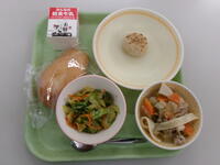 今日の給食(ごはん、ぎゅうにゅう、あつやきたまご、じょうしゅうきんぴら、ハクサイのみそしる、ぐんまのなっとう)今日は、ぐんまの郷土料理として群馬県の 特産品である、こんにゃく、 しいたけ、豚肉などが入って栄養満点な上州きんぴらと群馬県産大豆「さとのほほえみ」を100%使用したぐんまの納豆を提供しました。