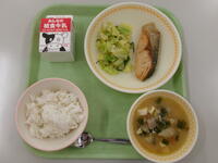 今日の給食(ごはん、ぎゅうにゅう、さけのしおやき、こんぶあえ、じょうしゅうとんじる)今日から1週間が全国学校給食週間となります。今日は、初めて学校給食が提供された時のメニューで提供しました。とは言え、やさいもたっぷりで栄養満点のメニューでした。ねぎ、こんにゃく、にら入りの上州豚汁です。