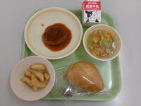 今日の給食(パーカーハウス、ぎゅうにゅう、にこみハンバーグ、フライドポテト、チキンスープ)今日は世界の料理でアメリカです。ハンバーガーにして食べた子もいました。フライドポテトは、人気メニューですね。「ポテトはLサイズでお願いします」と昨日から栄養教諭に依頼していた子もいるそうです。給食の時間に全クラスを回ってみるとほとんどの子がハンバーグとポテトをぺろりと平らげていました。おいしかったものを質問すると「スープ」と答えた子もいました。