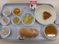 今日の給食(ミルクパン、ぎゅうにゅう、クリスピーチキン、コーンソテー、やさいのカレースープに)
