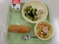 今日の給食(キャロットパン、ぎゅうにゅう、にこみちゃんぽん、ぐんまのしゅうまい、わかめサラダ)にこみちゃんぽんはイカやアサリが入った魚介味のスープでした。