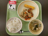 今日の給食(ごはん、ぎゅうにゅう、あつやきたまご、いりどり、こまつなのみそしる)
