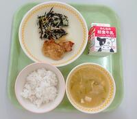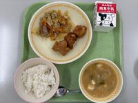 今日の給食(ごはん、ぎゅうにゅう、とりにくのからあげ、やさいのみそいため、なめこのみそしる)
