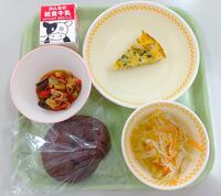 今日の給食(ココアパン、ぎゅうにゅう、スペイン風オムレツ、ラタトゥイユ、ジュリエンヌスープ)