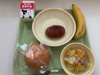 今日の給食(まるパン、ぎゅうにゅう、にこみハンバーグ、ポトフ、バナナ)バナナは、小学生は半分、中学生は1本でした。