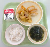今日の給食(ごはん、ぎゅうにゅう、あげぎょうざ、じゃがいものなんばんに、わかめスープ)