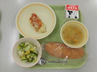 今日の給食(ロールパン、ぎゅうにゅう、ホキのピザやき、コーンサラダ、やさいスープ)ホキのピザやきが人気でした。小学部高学年は、残菜がほとんど出ませんでした。