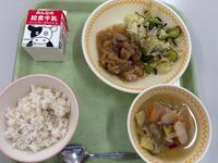 今日の給食(ごはん、ぎゅうにゅう、ぶたにくのしょうがやき、れんこんのいりに、なめこのみそしる)