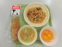 今日の給食(はちみつパン、ぎゅうにゅう、なすとトマトのスパゲティ、コンソメスープ、フルーツゼリーあえ)