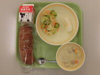 今日の給食(ごはん、ジョア、メンチかつ、えだまめサラダ、かみなりじる)