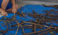 中学部作業の環境班は、新製品を開発中です。藍を育てて、藍の葉のたたき染め模様のエコバックを企画中です。葉の形の紙を使ってデザインコンテストをしました。投票の結果、2つの模様が選ばれて、たたき染め作業を始めました。仕上がりが楽しみです。
