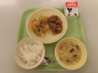 今日の給食(ごはん、ぎゅうにゅう、かんこくふうやきにく、はるさめサラダ、かきたまじる)