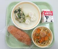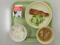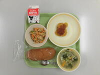 そして、今日の給食は「にゅうばいこんだて」です。群馬県で取れた梅を使った「ぐんまのうめゼリー」と旬のイワシを使った「いわしのおろしに」が出ました。(ごはん、ぎゅうにゅう、いわしのおろしに、ひじきサラダ、じょうしゅうとんじる、うめゼリー)インタビューに答えてくれた中学生は、イワシのおろし煮がおいしかった。おかわりしましたと話していました。