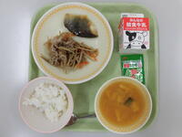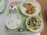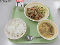 今日の給食(ごはん、ぎゅうにゅう、とりにくのごまみそやき、だいずのいそに、なすいりとんじる)鶏肉のごまみそ焼きが人気でした。なすいりとんじるも、大豆の磯煮も具沢山で栄養たっぷりでした。