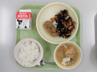 今日の給食(ごはん、ジョア、おうごんに、ごまずあえ、ワンタンスープ、ふりかけ)おうごんに(黄金煮)は、厚揚げ、根菜、こんにゃく、たけのこなどの煮物ですが子供が食べやすいように味付けにケチャップが使われています。昭和40年代に開発された給食の定番メニューだそうです。