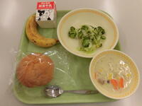 今日の給食(はちみつパン、ぎゅうにゅう、かぼちゃコロッケ、しらたきとやさいのサラダ、きゃべつとあさりのスープ)しらたきは、群馬県産の食材を使用しています。11時を過ぎたころ、給食のいい匂いがしてきて、来校者の方もおいしそうな匂いですねとおっしゃっていました。