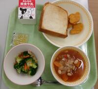 今日の給食(トースト、ぎゅうにゅう、チキンナゲット、ブロッコリーのサラダ、トマトゥンスープ、りんごジャム)トーストは、館特自慢のメニューです。地域の障がい者施設で作っている食パンを特別にスライスして納品していただき、学校の給食室で焼き上げて提供しています。今日は、季節の味のりんごジャム付きです。