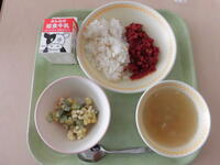 今日の給食(ゆうきまいごはん、ぎゅうにゅう、ビーツ入りドライカレー、サツマイモのマセドアンサラダ、コンソメスープ)